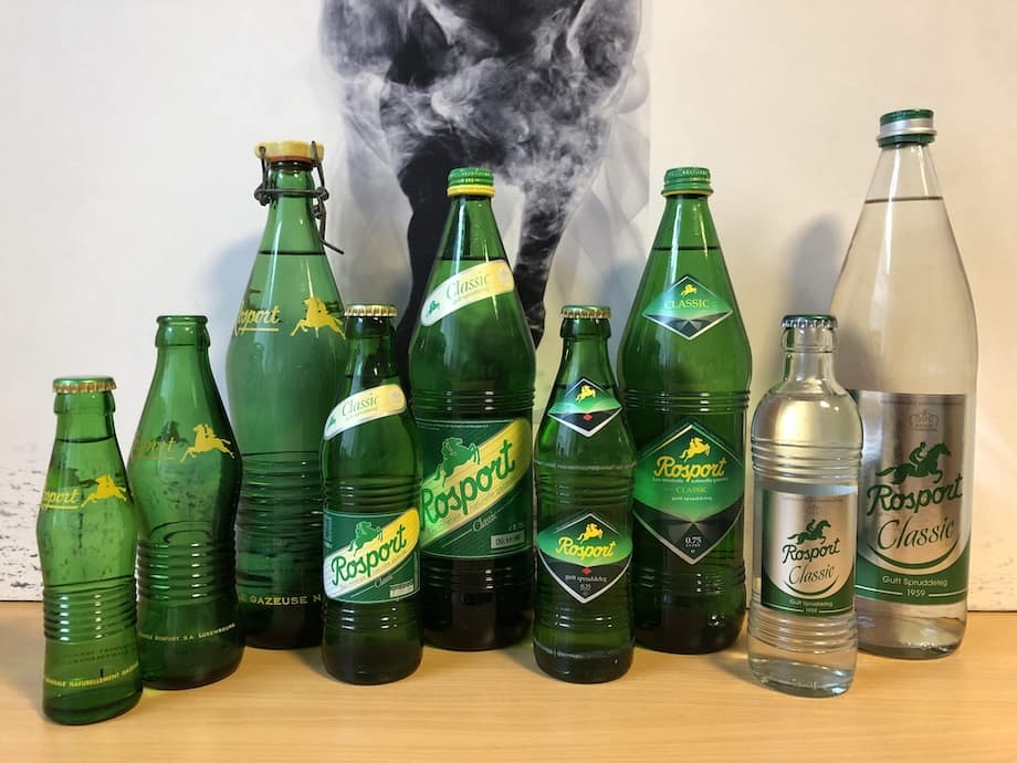 L’installation des machines et de la chaîne de soutirage se fait pendant l’été 1959, particulièrement chaud. C’est une bouteille de couleur verte, de style Art Déo qui est choisie pour contenir l’eau de Rosport. Quant au logo illustré par un cheval, il doit son explication aux traversées de la Sûre à dos de cheval à l’époque où le premier pont n’était pas encore construit. C’est en octobre de la même année qu’a lieu le premier soutirage des bouteilles de 20 cl.